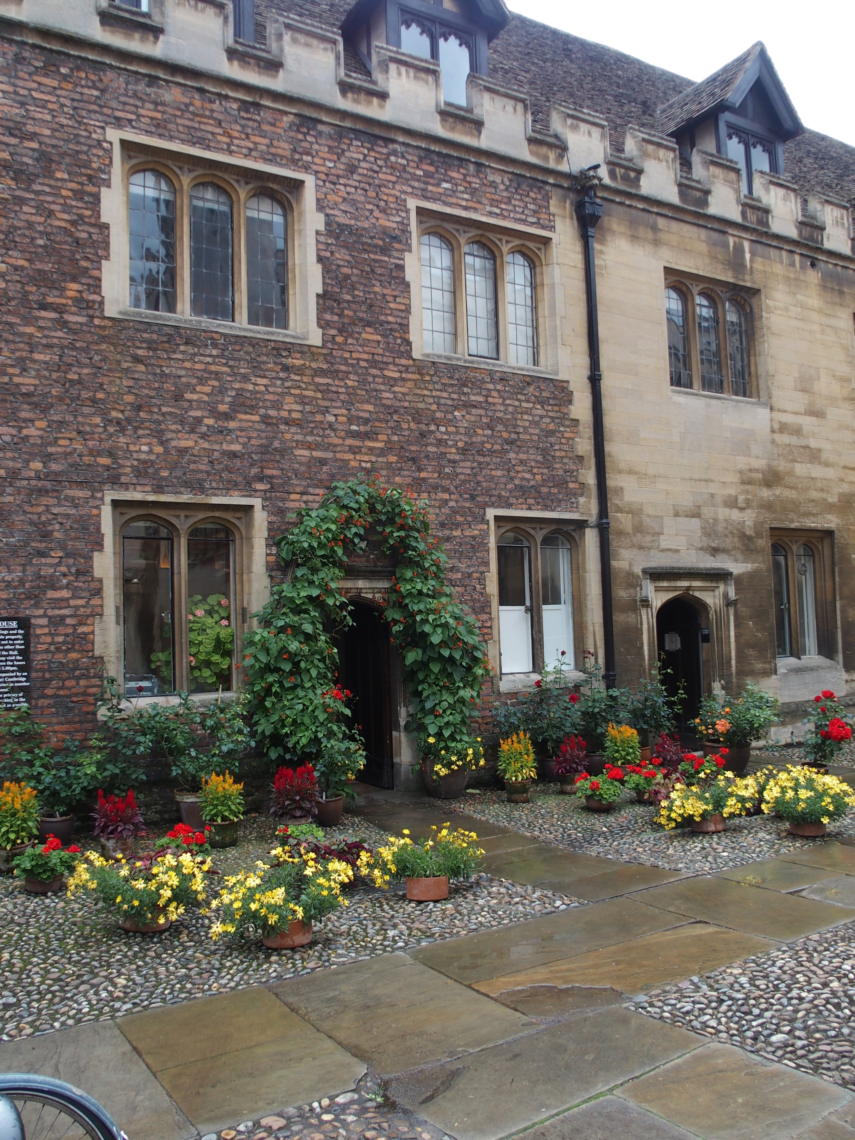 Peterhouse is the oldest college founded in 1284, although I don’t think this building dates back that far. I was taken by the ivy covered doorway, the lovely pots of flowers about and the balcony pots on each window. Fellows are graduates of the college, who are still involved in teaching or research or in some way, and obviously deserve a special parking spot – for their bicycle! Undergraduate students at Cambridge are forbidden to have a car within 10 miles of the university so bicycles are everywhere.